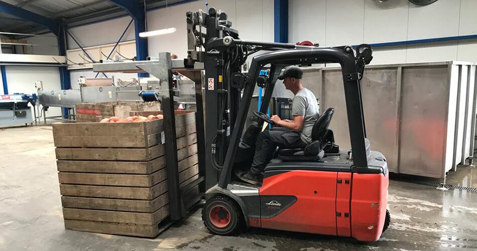 Voor het laden, lossen en verwerken van de pompoenen is wel zwaar materiaal nodig. Daarom maakt Jeroen gebruik van de heftrucks van Linde. “We hebben 4 elektrische heftrucks en 2 elektrische pompwagens (T20AP) van Motrac in het bedrijf.