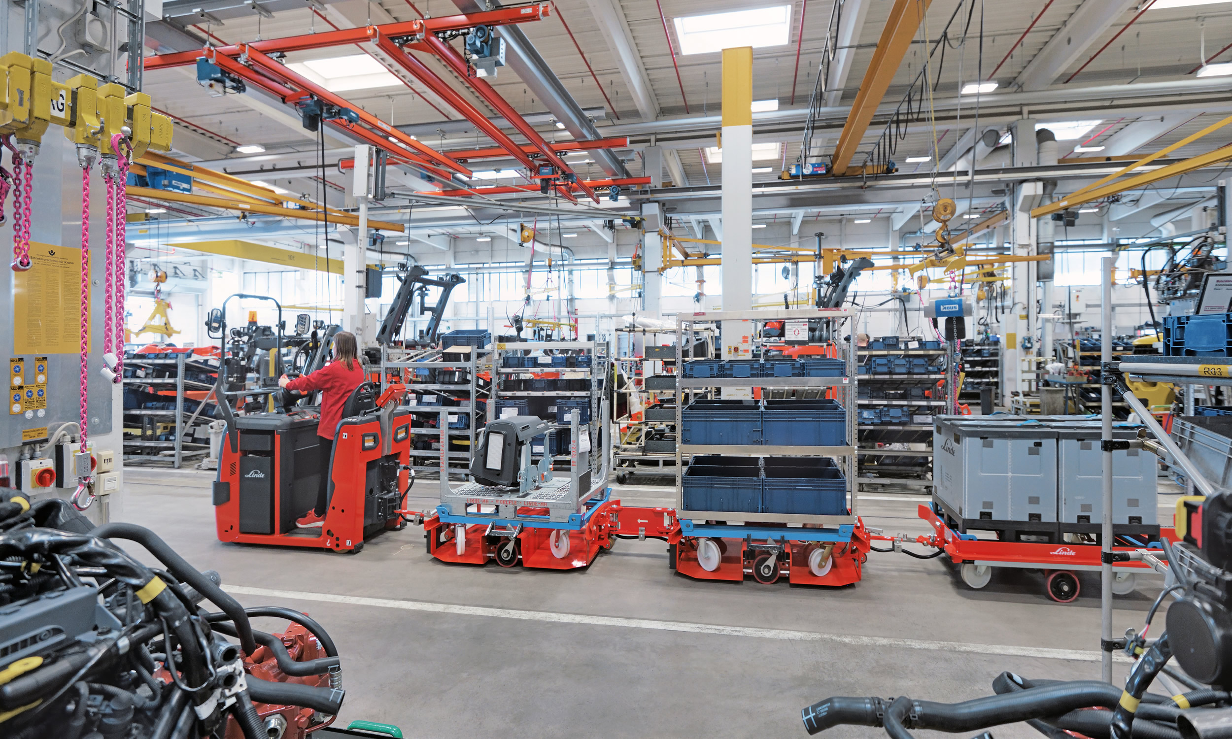 Logistieke treinen hebben een vaste plaats in moderne productie-omgevingen. Voor de aanvoer van materiaal op verschillende punten in de assemblage vervoeren ze grote hoeveelheden materiaal vanuit magazijnen en over bedrijfsterreinen over soms lange afstanden. De treinen bestaan uit een trekker en meerdere aanhangers en komen vooral voor bij just-in-time of just-in-sequence productie in de auto-industrie of machinebouw. De lading, die meestal op een trolley of rollend rek staat, wordt in het frame van de aanhanger geduwd en opgetild. Logistieke treinen verminderen de verkeersdrukte binnen een fabriek en het risico op ongelukken, terwijl ze zorgen voor planbare, betrouwbare logistieke processen. Gebundelde transporten kunnen voordelig zijn voor routes die langer zijn dan 160 meter.