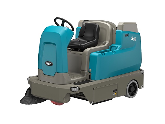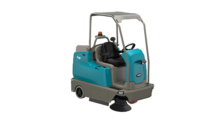 De Tennant S16 opzit veegmachine is geschikt voor verschillende oppervlakken en veegt verschillende soorten vuil op.