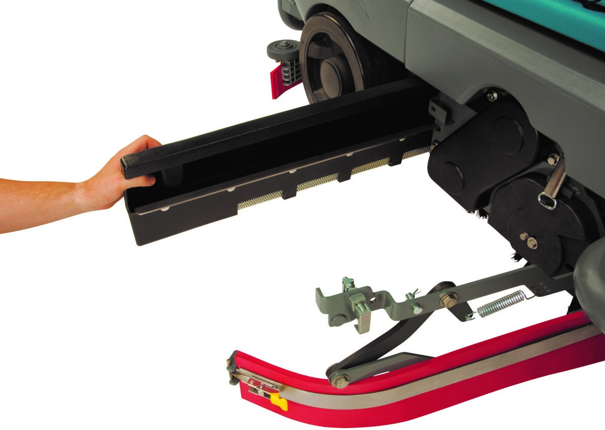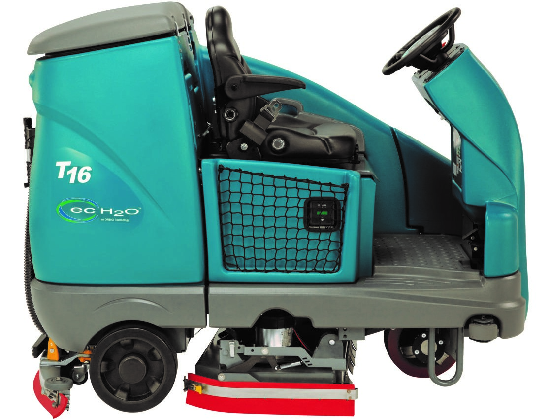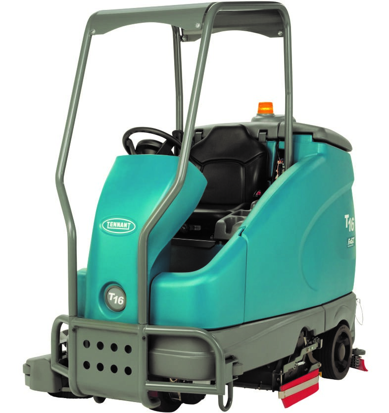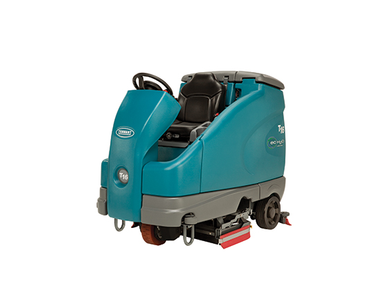 De krachtige borstels en zuigturbine van de Tennant T16 opzit-schrobzuigmachine reinigen zelfs de moeilijkste plekken.