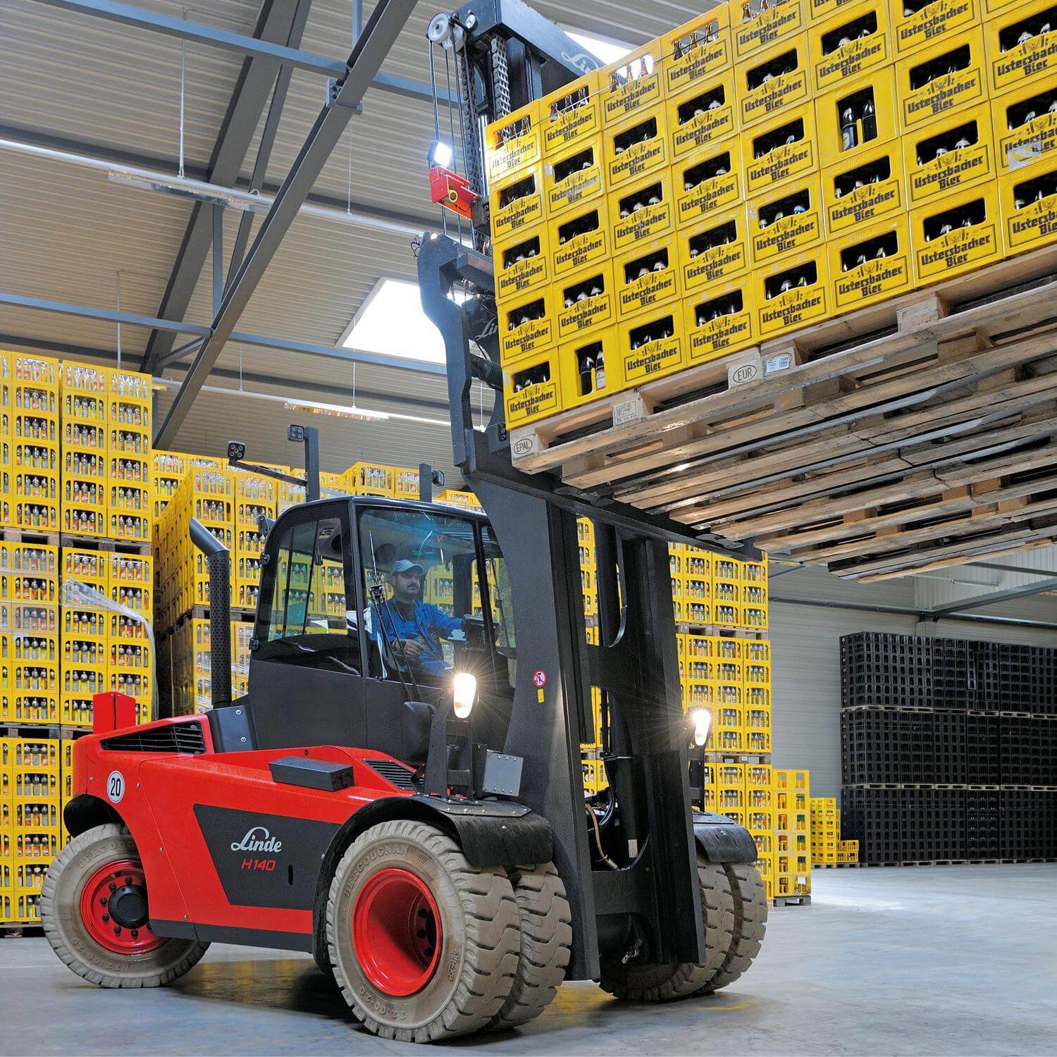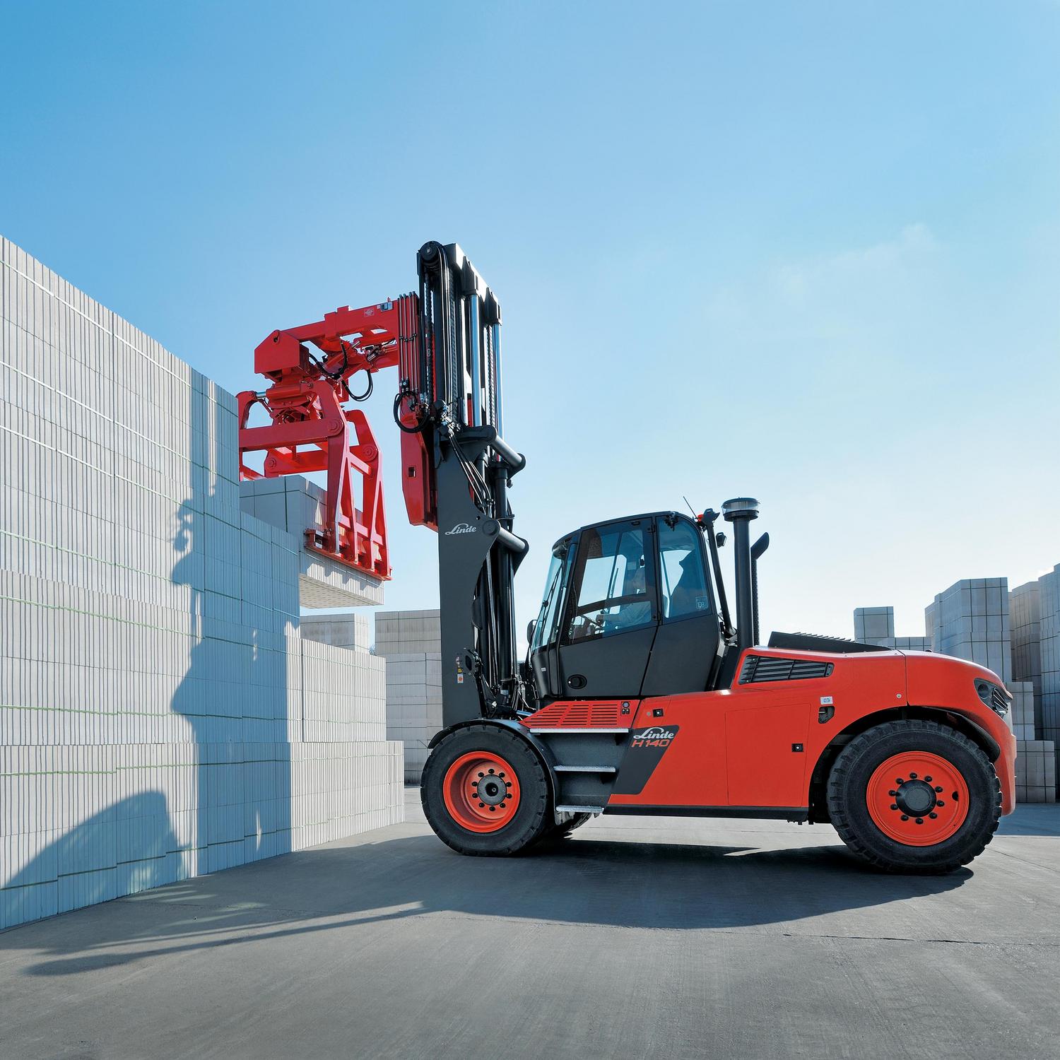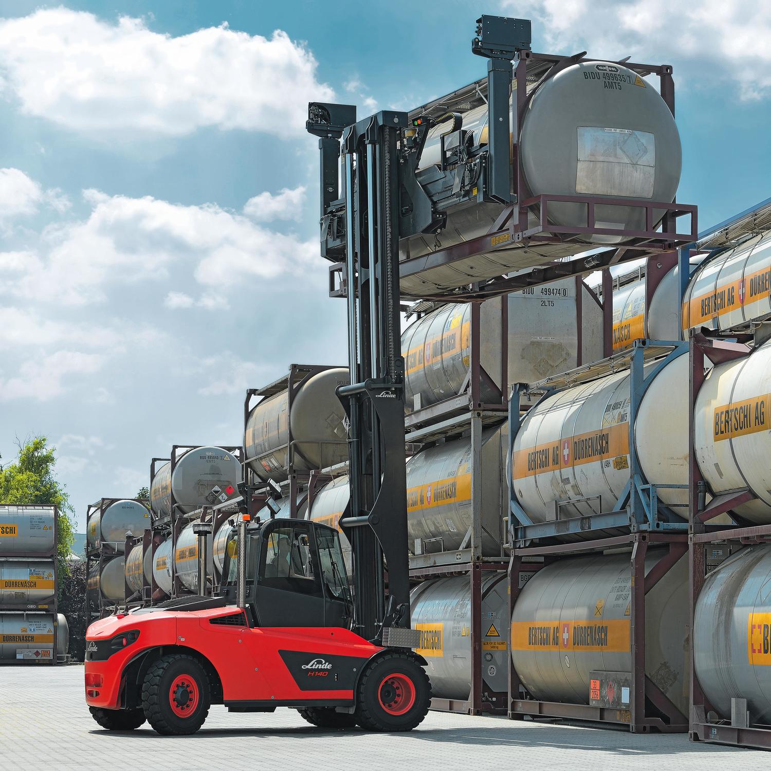 Een zware diesel heftruck voor het vervoer van zware lasten, inclusief lege containers. Uitgerust met de ultraprecieze Linde hydrostatische aandrijving en optimaal zicht rondom, ook naar achteren.