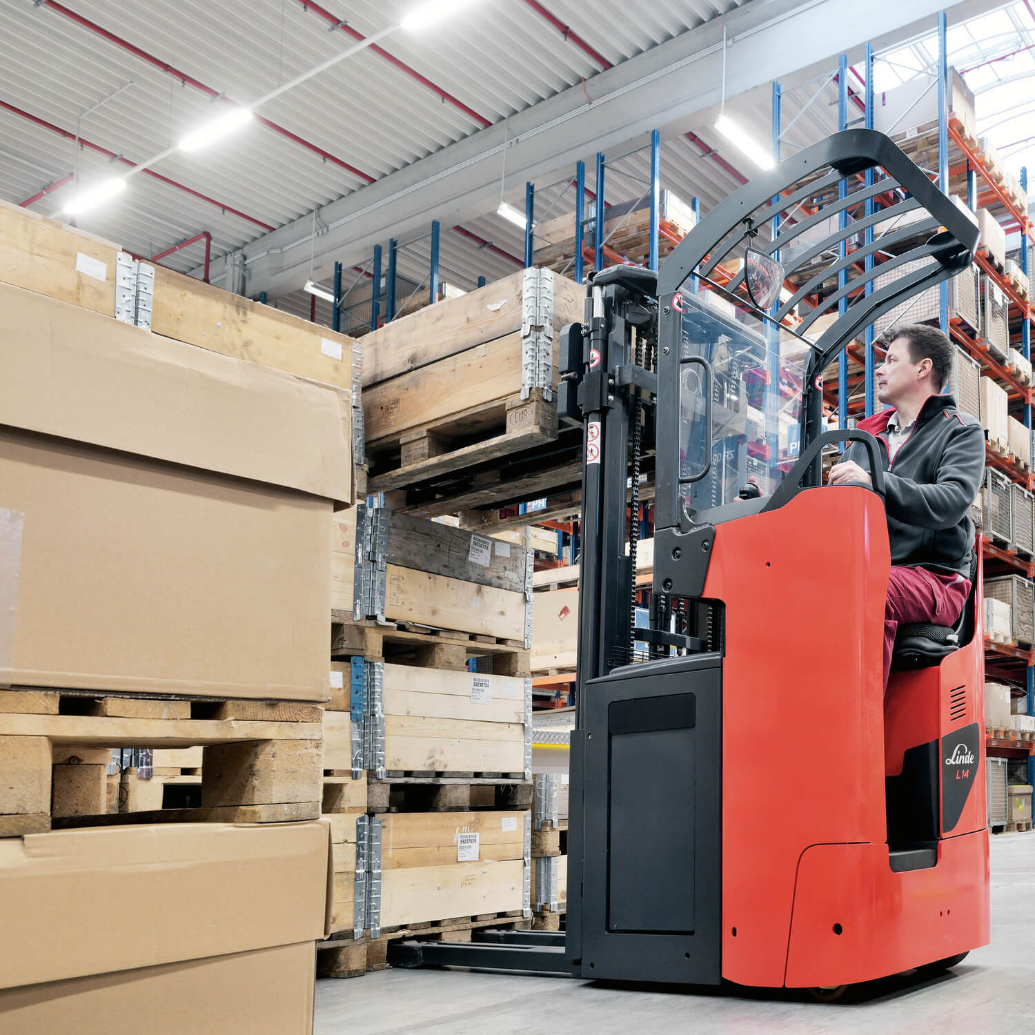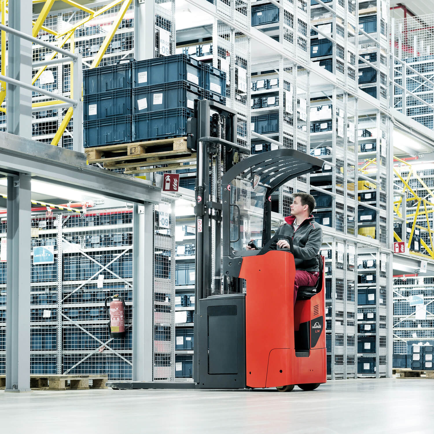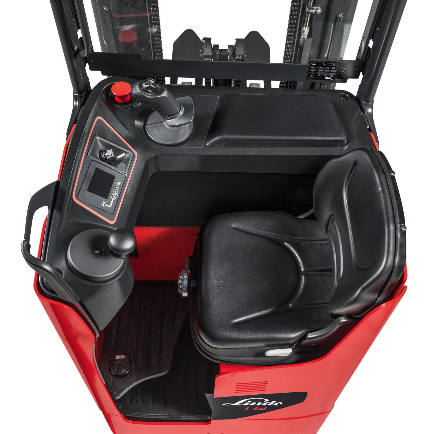 Deze stapelaar met zitplaats is ideaal voor vervoer over langere afstanden. Een van de vele voordelen van de truck is de hoge productiviteit, met een AC-motor van 3 kW die snelheden haalt tot 10 km/h.