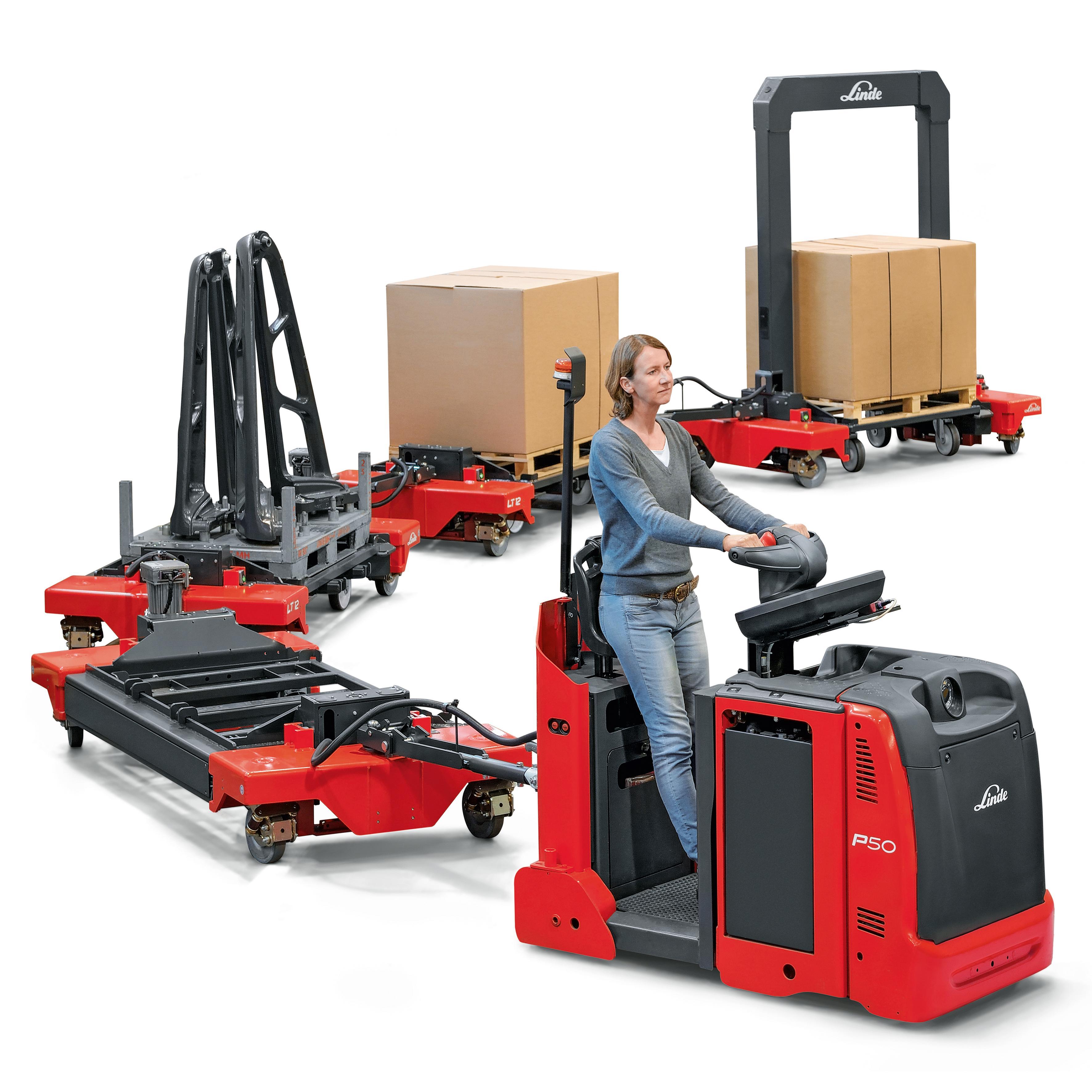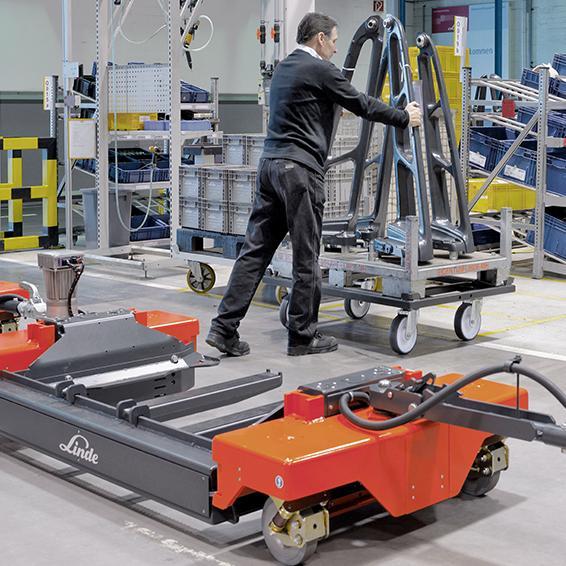 Deze logistieke trein van Linde bestaat uit een compacte trekker en 1 of meerder aanhangwagens. De logistieke trein is geschikt voor vervoer van verschillende soorten pallets, maar bijvoorbeeld ook rolcontainers.