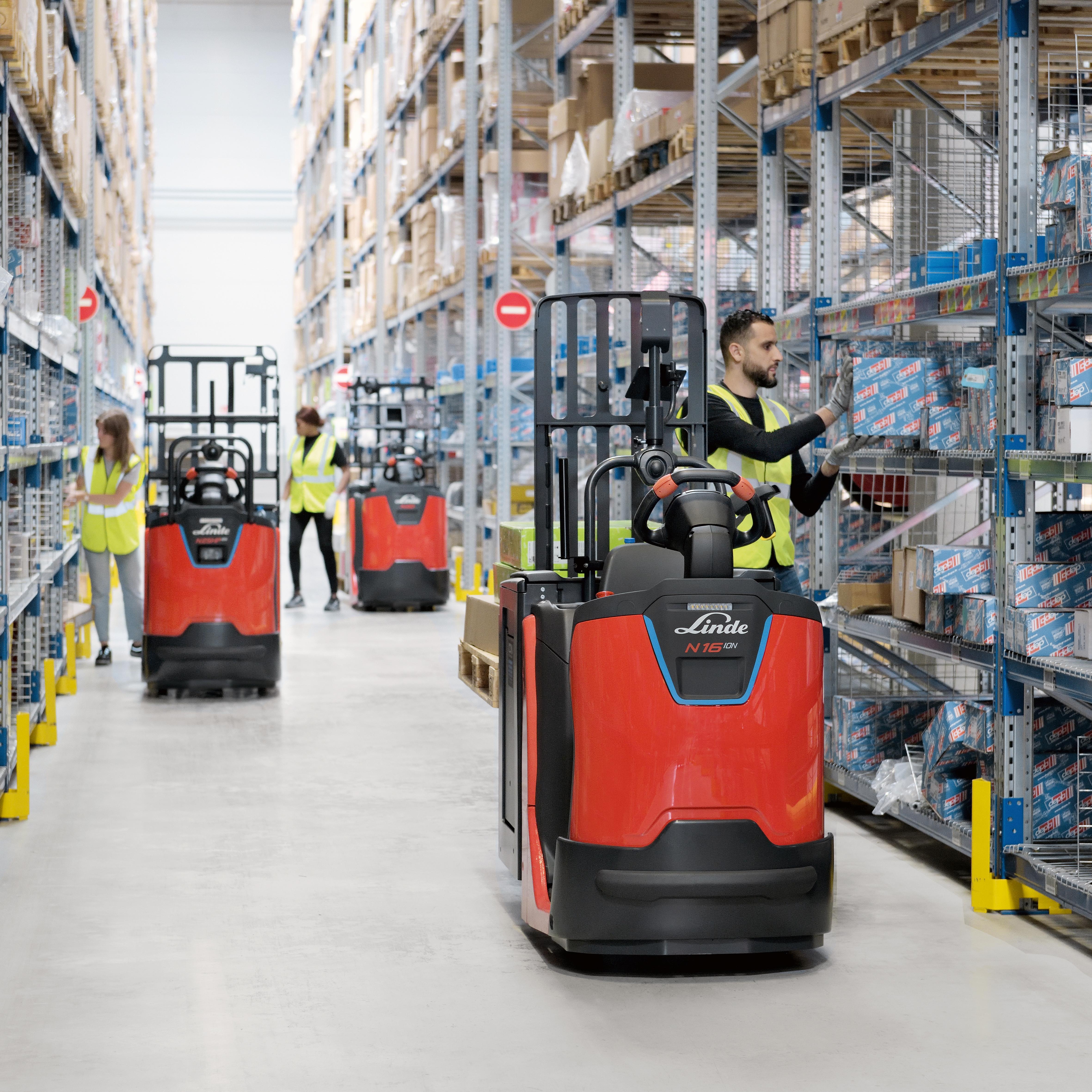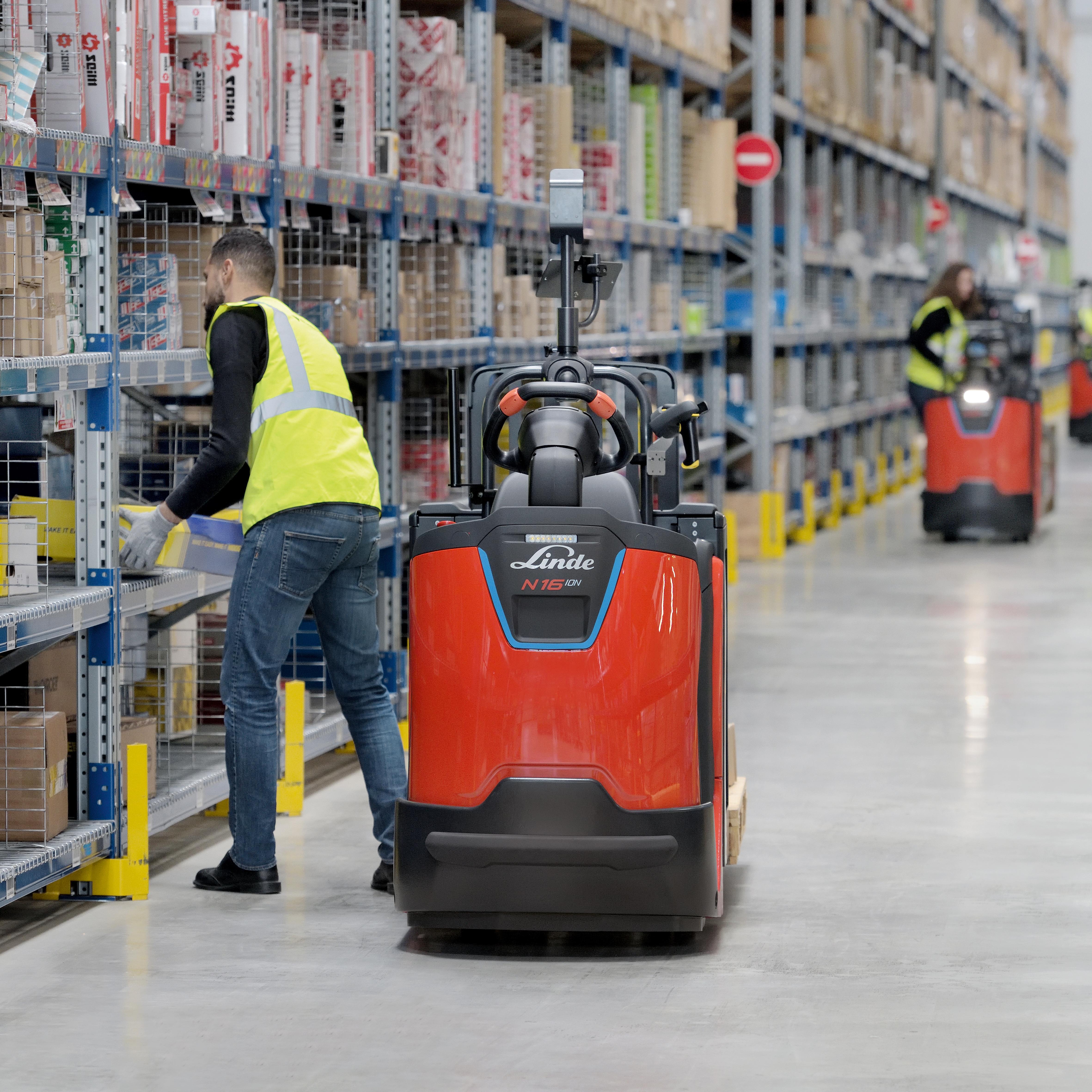 De N16 Li maakt een bijzonder hoog pickvermogen mogelijk: omdat het bestuurdersplatform vóór de batterij is geplaatst, heeft de bestuurder een goed zicht op de omgeving van het magazijn.
