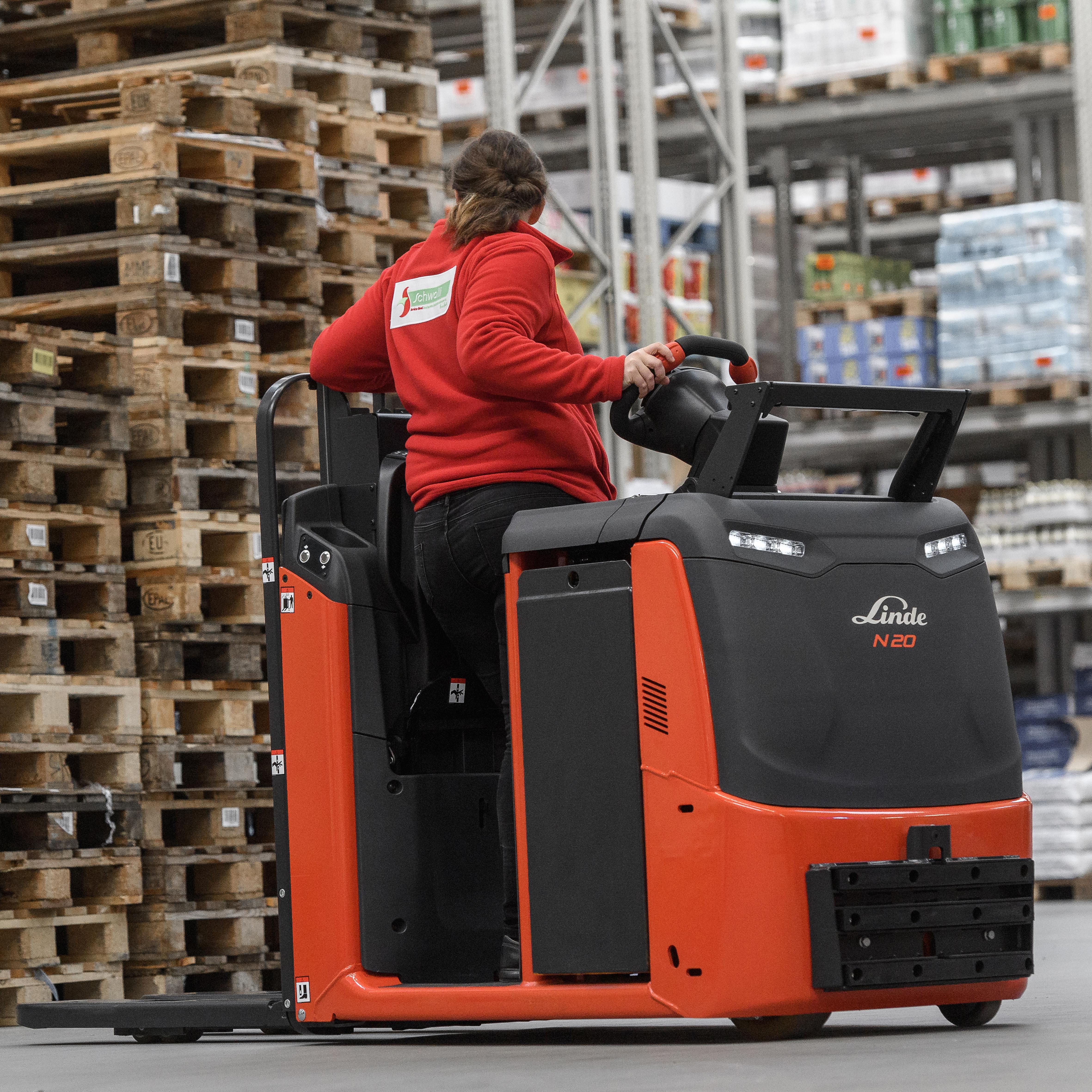 De orderpicker N20 C L vereenvoudigt het orderverzamelen met enkele pallets op meerdere manieren: Zonder lading accelereert het voertuig tot 12 km/h. In bochten wordt de snelheid automatisch verlaagd om bestuurders, goederen en voetgangers te beschermen.